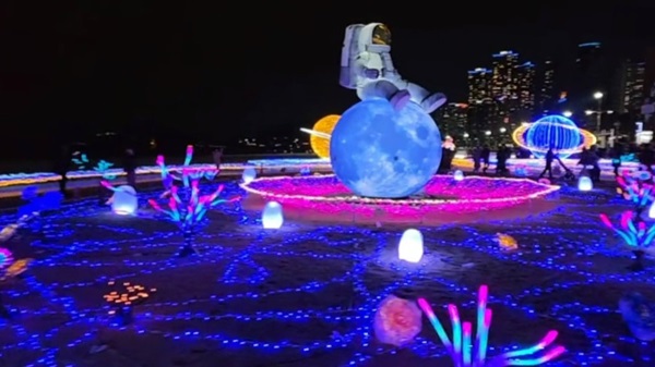 빛 축제의 조명들이 더욱 선명하게 빛납니다. 우주비행사는 달 위에서 지구를 내려다보고, 그 아래 우리는 별빛처럼 빛나는 수만 개의 LED 사이를 거닙니다.
